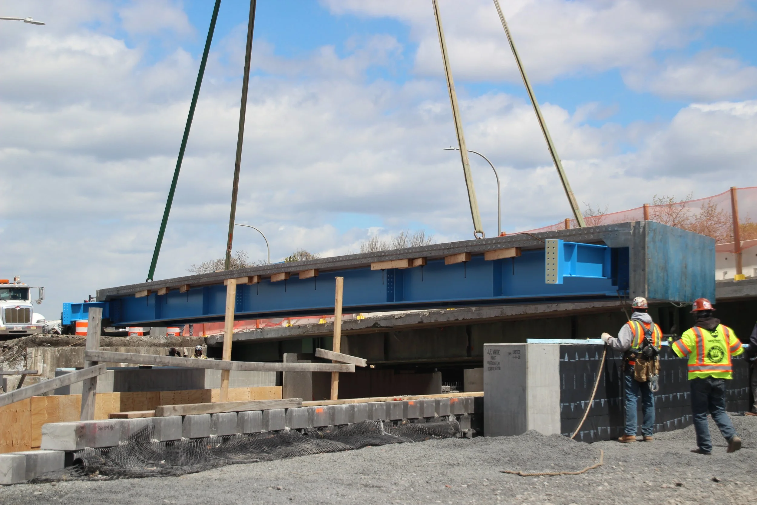 The existing three span, structurally deficient structures were replaced with single span bridges. The new bridges are comprised of steel plate girders made composite with precast concrete decks supported on precast concrete beam seats on GRS-IBS abutments. The PBUs required deck closure pours made with fast-setting concrete, which attained the required compressive strength within 24-hours. Beam seat and GRS detailing allowed the majority of abutment construction to occur offline prior to the construction windows.